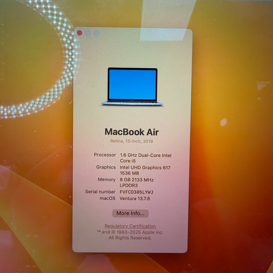 2019 Apple MacBook Air 13.3" i5 1.6GHz 8GB RAM 128GB SSD Silver A1932
